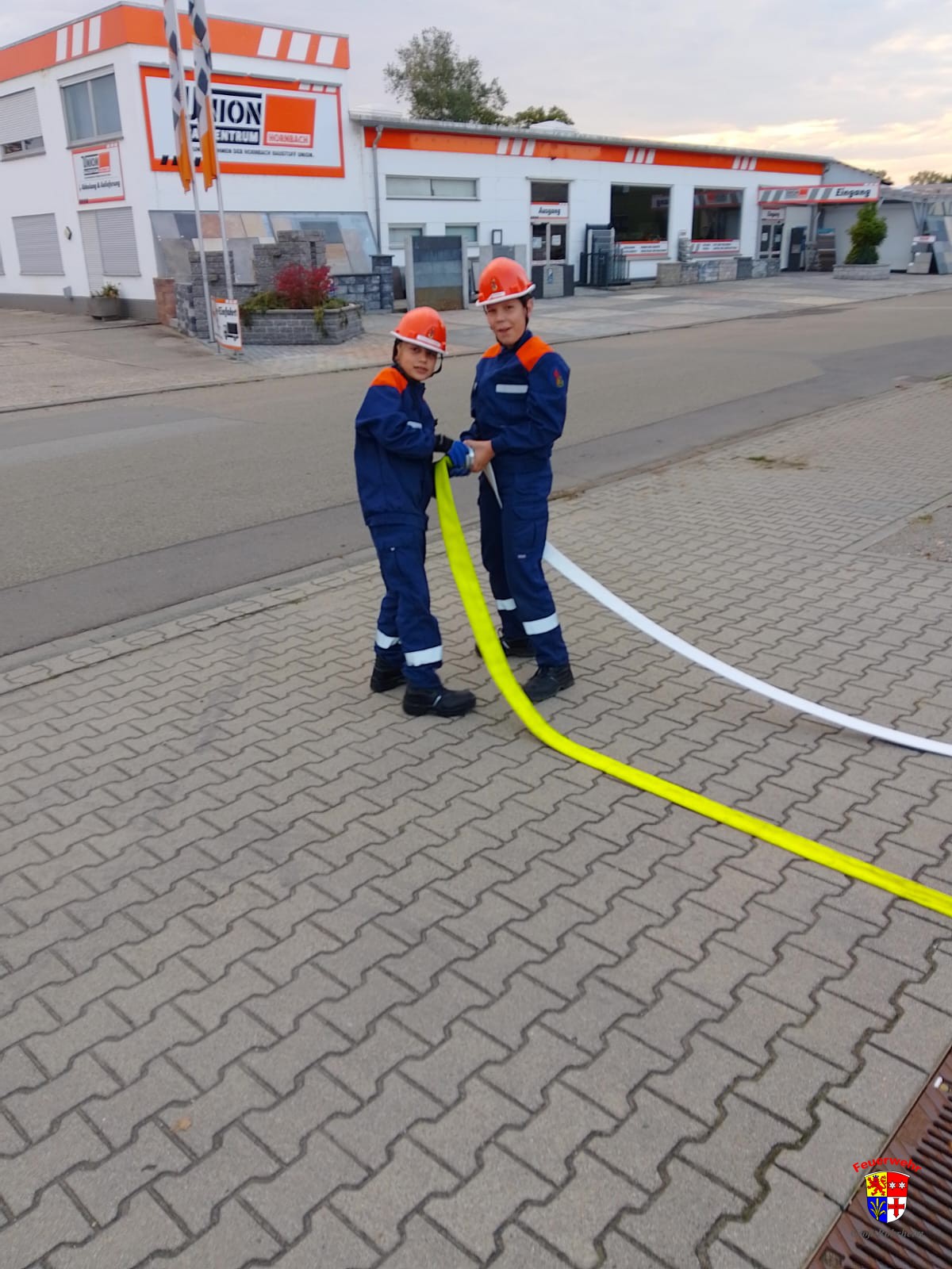 Die Jugendlichen mussten in zweier Teams je zwei Schläuche ausrollen, sauber auslegen, zusammenkuppeln und dann wieder aufrollen.