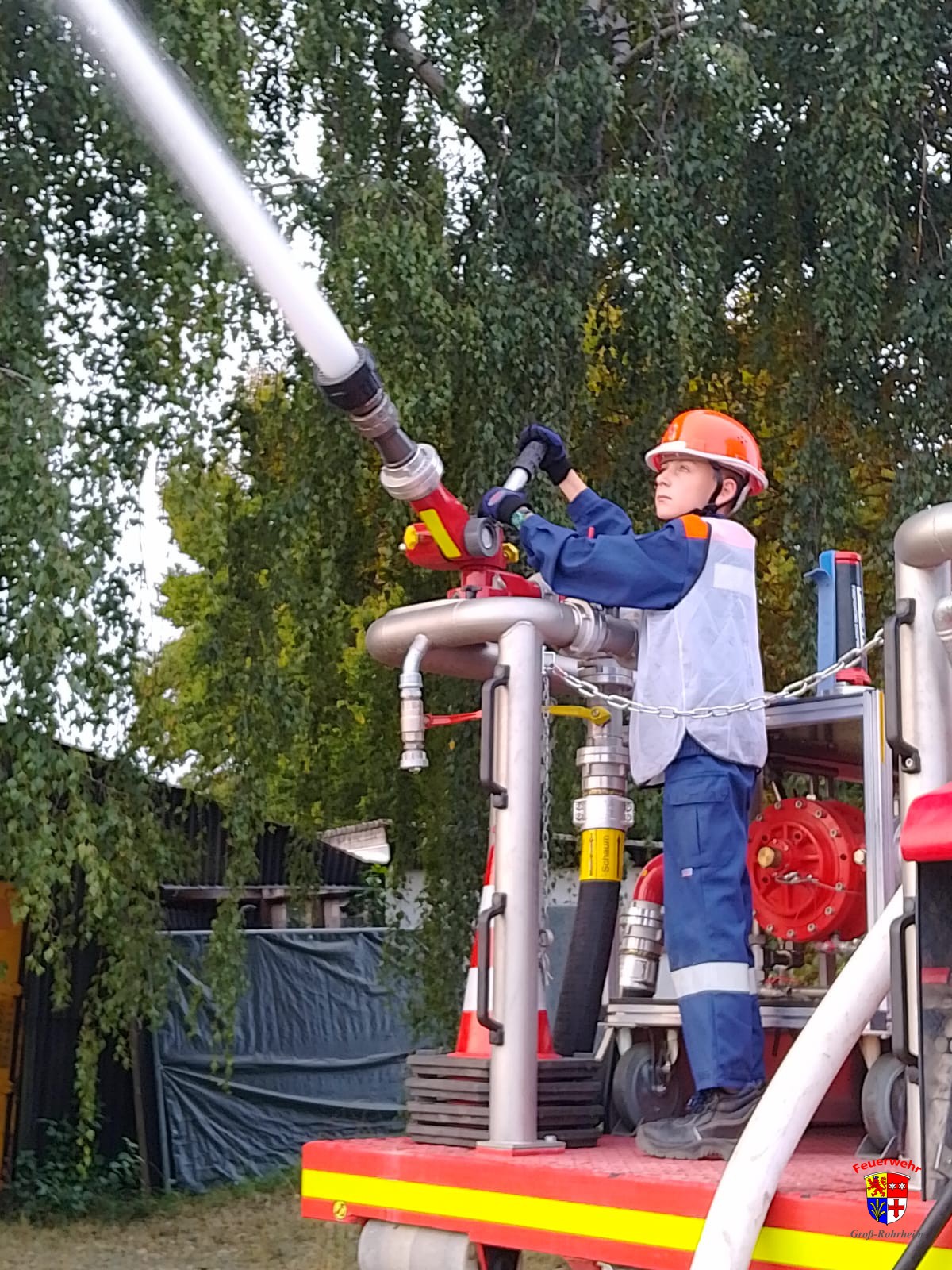 Die anwesenden Jugendlichen wurden in zwei Gruppen eingeteilt. Schnell war eine stabile Wasserversorgung zu den beiden Löschfahrzeugen aufgebaut und schon hieß es WASSER MARSCH aus 6 Rohren und einem Wasserwerfer.